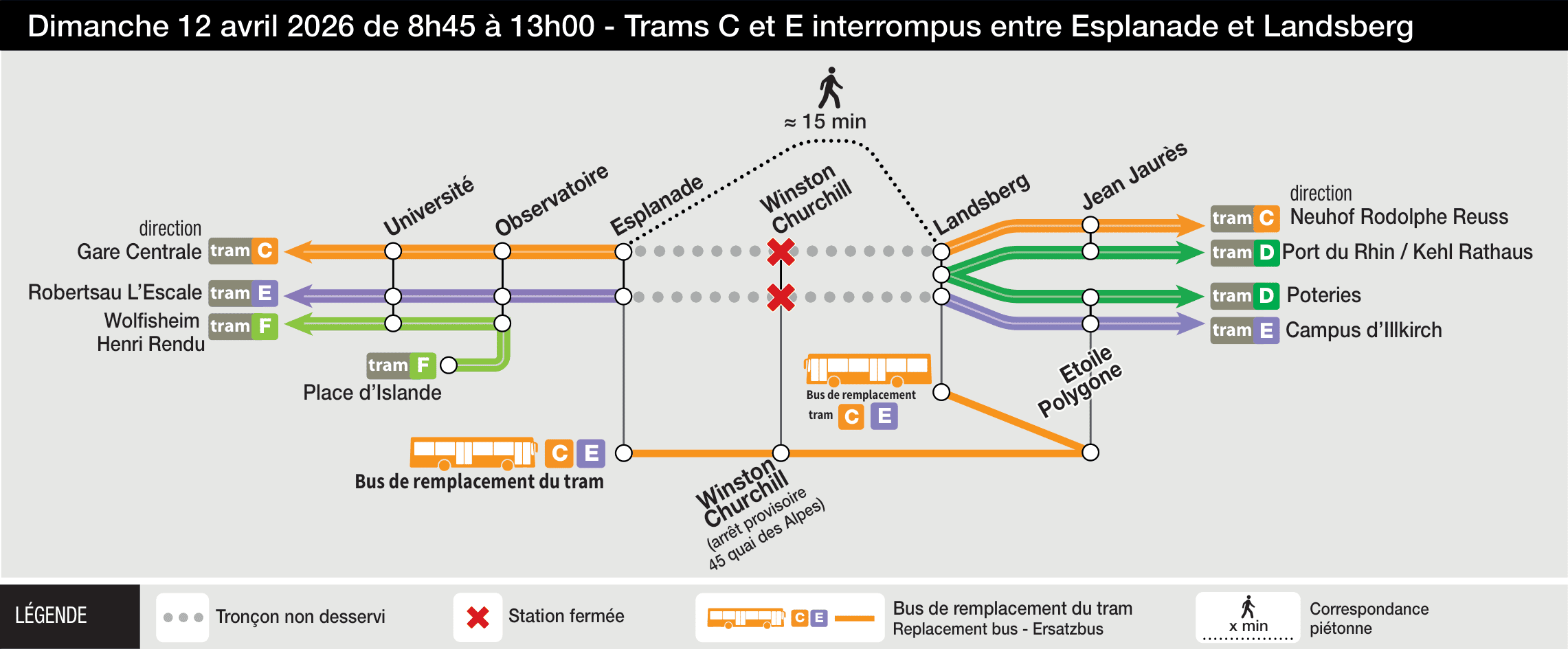 Les arrêts Ostwald Hôtel de Ville et CREPS ne sont pas desservis dans les deux directions.